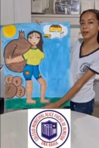 Ana Lua, aluna do 7º ano do Colégio Municipal Alice Fuchs de Almeida (CMAFA), em Una, está brilhando no Concurso do Ministério Público do Trabalho (MPT) na categoria de Desenho, com participantes da Bahia toda. A jovem artista criou uma obra, entitulada “Sonho de ensino”, em que retrata uma criança em situação de trabalho, que, segundo suas palavras, deveria estar na escola.