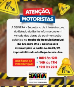 A Secretaria de Infraestrutura da Bahia informou que, devido às obras de pavimentação na estrada que liga Una à Colônia, o tráfego de veículos será temporariamente interrompido a partir do dia 23 de setembro. A medida visa garantir a segurança dos trabalhadores e condutores, além de agilizar o progresso das obras.